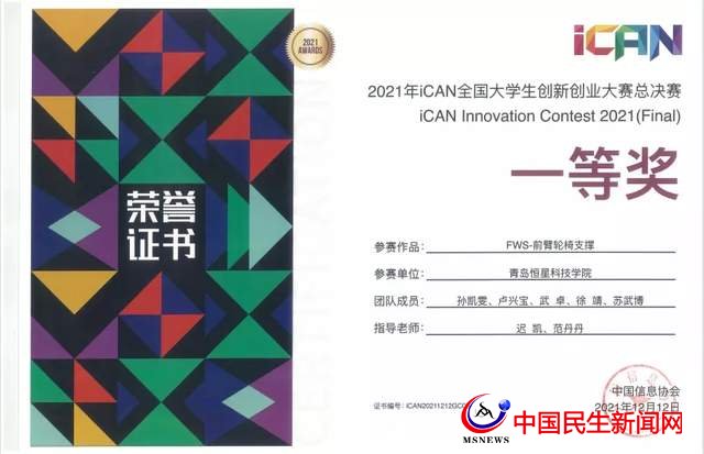 中國民生新聞網(wǎng)訊 近日,在剛剛結(jié)束的ICAN全國大學(xué)生創(chuàng)新創(chuàng)業(yè)大賽總決賽中,青島恒星科技學(xué)院參賽團隊榮獲一等獎1項,二等獎1項,三等獎1項的好成績,突破本賽事歷史最好成績。