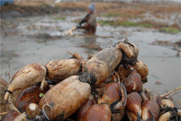 12月2日,寒風(fēng)料峭,冬意濃濃。山東青島市即墨區(qū)靈山街道大河套村的160畝無(wú)公害淺水藕種植田里,卻是一派繁忙的景象,一筐筐鮮嫩的藕從秧田里刨出來(lái),被來(lái)來(lái)往往的車輛運(yùn)走。