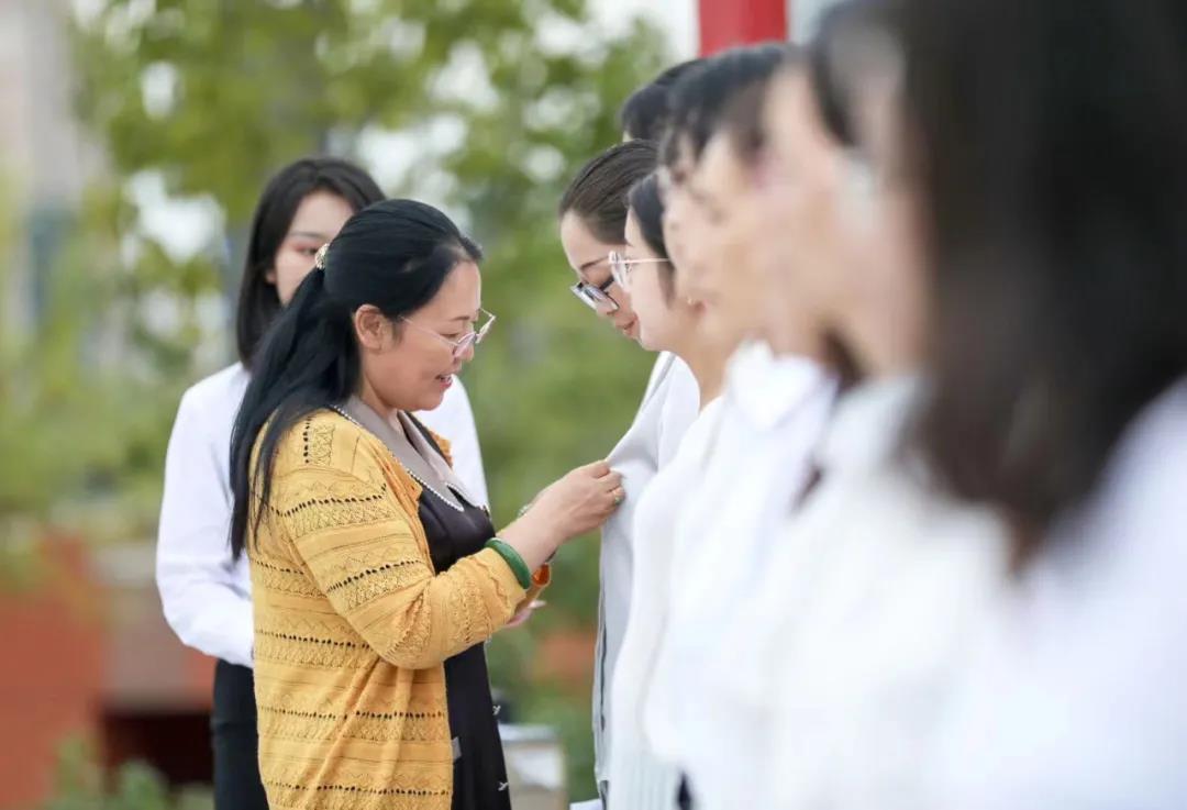 隨后,校黨委副書記、執(zhí)行校長(zhǎng)徐愛(ài)民,組織部部長(zhǎng)黃巖及青島第五屆高校教學(xué)名師獲得者莊新穎、單菁華為新進(jìn)教師佩戴?;铡?/p>