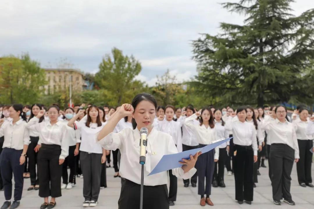 學(xué)校優(yōu)秀教師代表,馬克思主義學(xué)院教師劉鎖霞領(lǐng)誓。全體新入職教師舉起右手面對(duì)國(guó)旗和校旗莊嚴(yán)宣誓,志愿做一名光榮的人民教師,對(duì)黨和人民的教育事業(yè)進(jìn)行了莊嚴(yán)承諾。