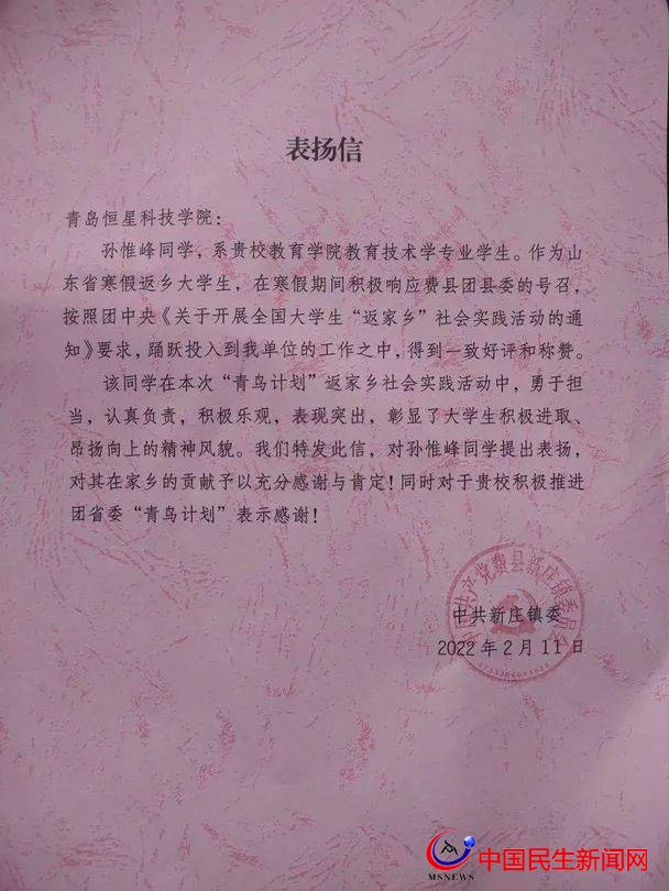 教育學(xué)院19級(jí)孫惟峰同學(xué)在寒假期間積極響應(yīng)國(guó)家疫情防控的號(hào)召,中共新莊鎮(zhèn)委來(lái)信表達(dá)對(duì)他工作踏實(shí)肯干、認(rèn)真負(fù)責(zé)的認(rèn)可。