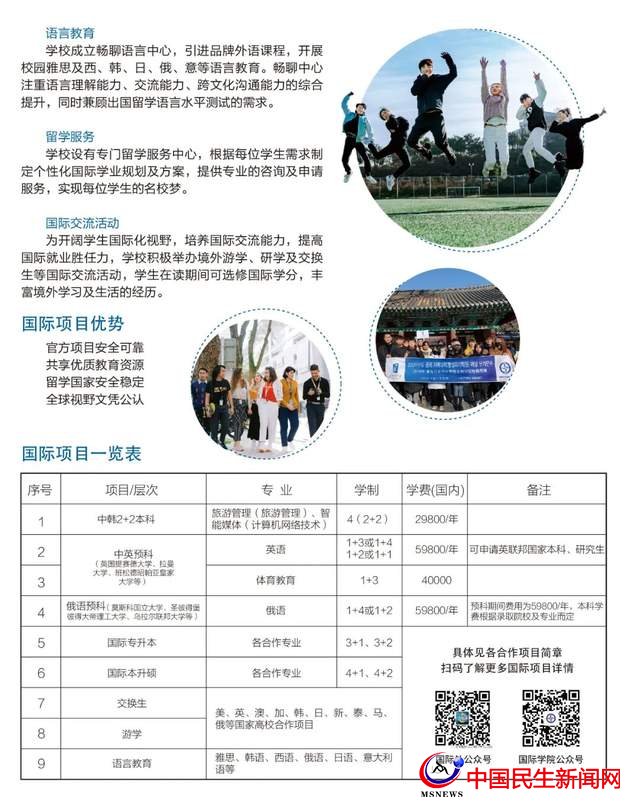 為提升學(xué)校國際化教育教學(xué)水平,大力培養(yǎng)具有國際化素養(yǎng)的高層次應(yīng)用型人才,學(xué)校先后與莫斯科國立大學(xué)、德國德累斯頓大學(xué)、英國提賽德大學(xué)、烏拉爾聯(lián)邦大學(xué)、圣彼得堡彼得大帝理工大學(xué)、加拿大萊姆頓學(xué)院、澳大利亞南十字星大學(xué)、韓國崇實(shí)大學(xué)、全州大學(xué)等等16個(gè)國家的60余所高校開展國際交流與合作,優(yōu)質(zhì)的國際教育資源、濃厚的國際化氛圍和一站式的國際化教育平臺,為學(xué)生國際化素養(yǎng)的培養(yǎng)提供了良好條件,學(xué)生在畢業(yè)前達(dá)到要求,即可申請到國外知名大學(xué)攻讀本科或碩士學(xué)位。