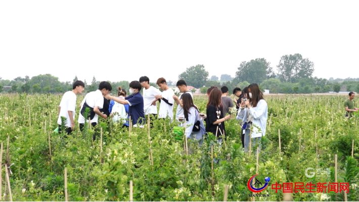 接著,大家來到金銀花種植基地進行參觀,基地工作人員對金銀花的播種、開花、采摘等不同種植周期進行了詳細介紹,并對現(xiàn)存的金銀花種類、辨別方法及功效等內(nèi)容進行了現(xiàn)場講解,參觀團成員們還現(xiàn)場體驗了金銀花采摘的過程。