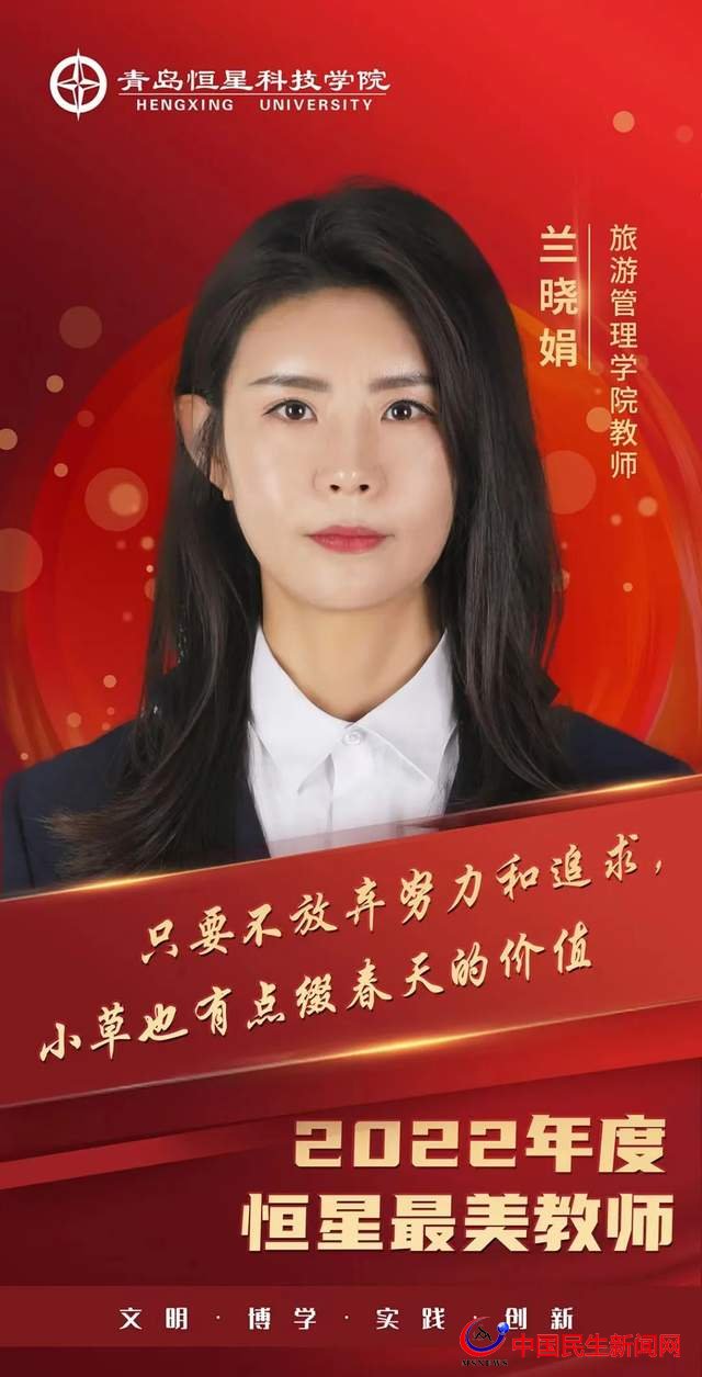 蘭曉娟,中共黨員,研究生學(xué)歷,碩士學(xué)位,副教授職稱,畢業(yè)于中國人民大學(xué),現(xiàn)任青島恒星科技學(xué)院旅游管理學(xué)院教師兼班主任。從事教學(xué)科研工作8年以來,先后主持參與省級科研立項2項,校級科研立項5余項,發(fā)表論文10余篇,指導(dǎo)學(xué)生參加國家及省市級大賽獲獎30余次,多次獲國家級、省市級“優(yōu)秀指導(dǎo)教師”榮譽。作為一名優(yōu)秀的“雙師”型教學(xué)能手,先后被學(xué)校評為“優(yōu)秀共產(chǎn)黨員”“優(yōu)秀教師”“優(yōu)秀班主任”。