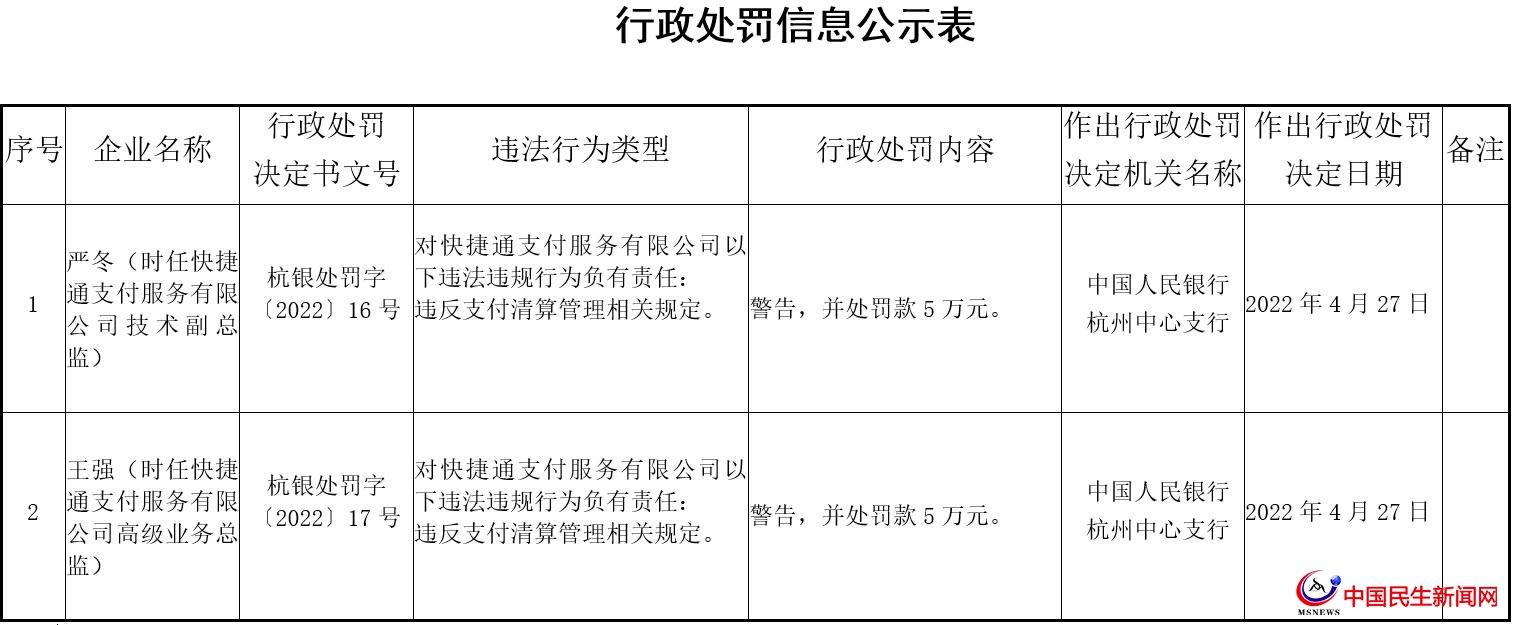 金融虎網(wǎng)注意到,5月10日,快捷通支付兩名管理人員嚴冬和王強均因對“違反支付清算管理相關規(guī)定”負有責任,分別被給予警告,并各處罰款5萬元。嚴冬時任快捷通支付服務有限公司技術副總監(jiān),王強時任快捷通支付服務有限公司高級業(yè)務總監(jiān)。
