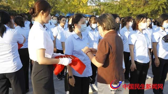 隨后,出席此次活動的領(lǐng)導(dǎo),滿含深情的逐一為每名新教師佩戴上金光閃閃的?;?。