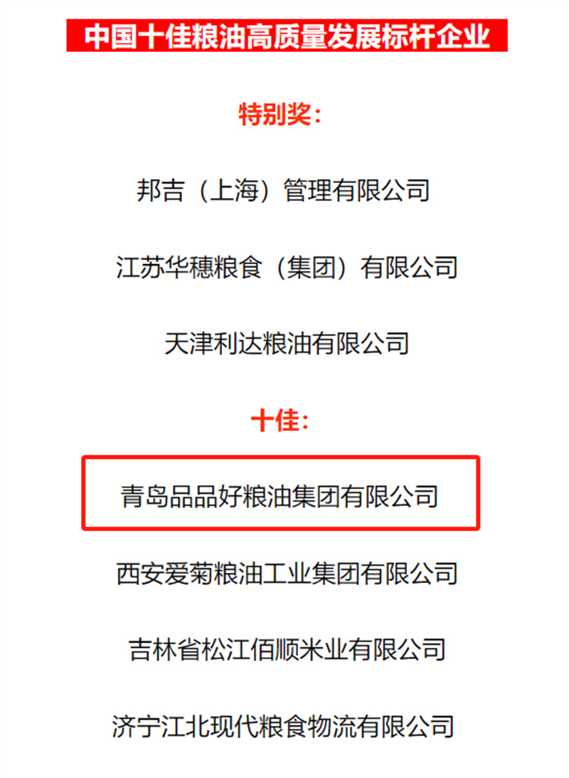 近日,第十四屆中國(guó)糧油榜正式開榜。青島品品好糧油集團(tuán)有限公司憑借多年來(lái)卓越的表現(xiàn),榮獲了“中國(guó)十佳糧油高質(zhì)量發(fā)展標(biāo)桿企業(yè)”的殊榮。