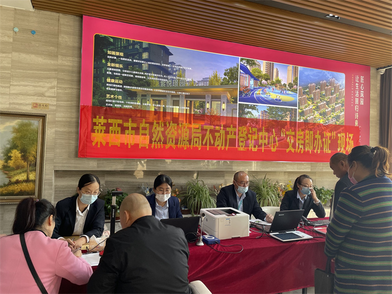 據(jù)悉,“交房即辦證”工作是萊西市學(xué)史力行,深入推進(jìn)“互聯(lián)網(wǎng)+不動(dòng)產(chǎn)登記”的一項(xiàng)重要舉措。為更好的服務(wù)企業(yè)和群眾,讓百姓買房省心、辦證舒心,萊西市創(chuàng)新“聯(lián)合驗(yàn)收”,統(tǒng)籌多個(gè)部門共同參與,由原來的坐等服務(wù)到現(xiàn)在的上門服務(wù),由原來“折返跑”多部門到現(xiàn)在的多部門集中辦公服務(wù),不僅壓縮了工作流程,而且減少了工作時(shí)限。在紫悅璟園小區(qū)交房現(xiàn)場,工作人員通過“一人一機(jī)一窗”新模式受理業(yè)主不動(dòng)產(chǎn)登記申請(qǐng),經(jīng)不動(dòng)產(chǎn)登記和稅務(wù)部門后臺(tái)人員審核后,申請(qǐng)人在交房現(xiàn)場繳納稅費(fèi)后直接領(lǐng)到不動(dòng)產(chǎn)權(quán)證書。兩天時(shí)間,共計(jì)76戶業(yè)主在現(xiàn)場辦理不動(dòng)產(chǎn)登記手續(xù)并領(lǐng)取了證書。