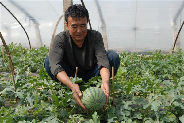“這是頭茬大棚西瓜,人工授粉已持續(xù)半個多月,現(xiàn)在又開始對瓜蔓打叉,每個西瓜都有‘身份證’,標注授粉日期,能準確掌握成熟時間,確保西瓜口感。”孫洪寶介紹,頭茬西瓜口感好,產(chǎn)量低,價格高。