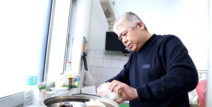 將熱好的西紅柿炒雞蛋、饅頭、熟肉、牛奶等倒入破壁機(jī),打成流食倒入碗中,再將半塊香蕉加入白開水,兌進(jìn)酸奶和膳食纖維,打成濃稠的飲料……3月20日早上,在北墅監(jiān)獄一座年代感十足的宿舍樓里,王海亮正在廚房里忙活著。為了不耽誤上班,每天他都要早早起床,給臥床近19年的植物人妻子準(zhǔn)備餐食。“這些飯是前一天晚上就做好的,是為了節(jié)省做早餐和午餐的時(shí)間,每餐都得講究營(yíng)養(yǎng)均衡,她喝水容易嗆著,加香蕉既能方便吞咽,還能促進(jìn)腸蠕動(dòng)。”王海亮一邊忙活,一邊告訴記者。