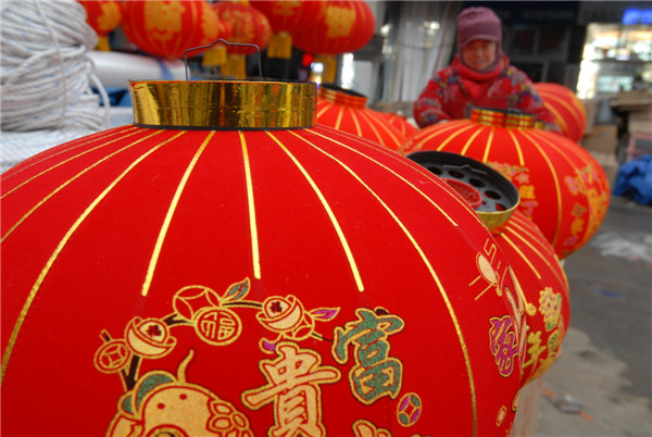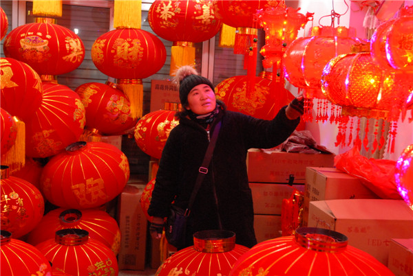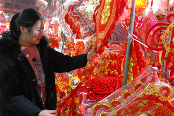 1月15日,顧客在山東青島市即墨區(qū)小商品城選購新年飾品。 隨著新春佳節(jié)的臨近,山東青島市即墨區(qū)小商品城的年貨市場日漸紅火,攤位上喜氣洋洋,店鋪擺滿了燈籠、福字、金牛等新年飾品,紅燈籠、中國結、電子鞭炮、對聯(lián)、掛件等新年飾品和琳瑯滿目的商品吸引著眾多的顧客。即墨區(qū)小商品城迎來喜慶用品節(jié)前銷售旺季。