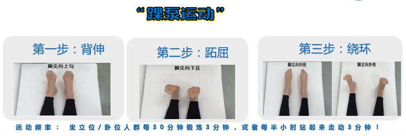 ◆踝泵運動是絕大多數(shù)人群都可以學(xué)習(xí)掌握并行之有效的VTE預(yù)防方法。具體運動方法如下: