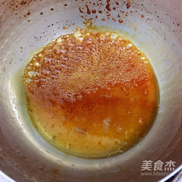 1.將糖與適量熱水加入湯鍋加熱煮沸,轉中小火,繼續(xù)加熱。氣泡由多變少,糖液變粘稠
