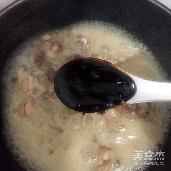 6.雞皮金黃,肉泛白烹入少許料酒,并煮沸揮發(fā)。