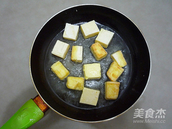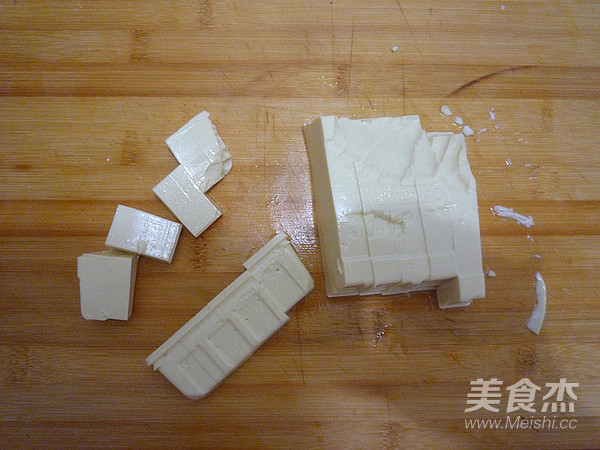 3.腌漬蝦仁和雞片的時(shí)候來處理嫩豆腐,嫩豆腐取出切塊