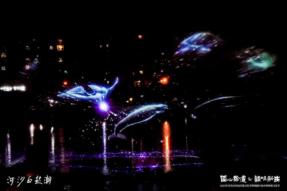 尤其顛覆想象的是,在非遺水陸光影秀《潮起白沙河》中,“非遺+藝術(shù)+科技”的組合模式,令人耳目一新,流連忘返——朱鹮、白鷺、文鰩魚、山、海、云、傳統(tǒng)書法等元素通過水幕光影的形式,為大眾營造出超酷炫的夢幻空間。