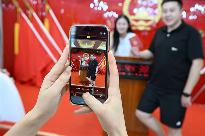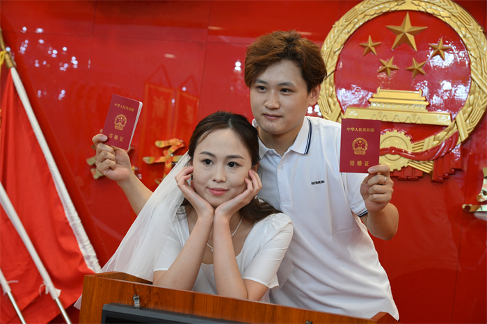 即墨區(qū)民政局婚姻登記處到處洋溢著幸福的氣息,祝福這一對對新人都能夠白頭偕老,幸福地生活下去。喜氣洋洋的頒證廳、浪漫唯美的網(wǎng)紅打卡角、隨處可見的喜字與拉花……在婚姻登記處,領(lǐng)證后拍照留念的新人隨處可見,對他們來說,七夕是象征愛情的節(jié)日,象征著乞巧,祈愿,企盼婚姻幸福甜蜜,圓圓滿滿。