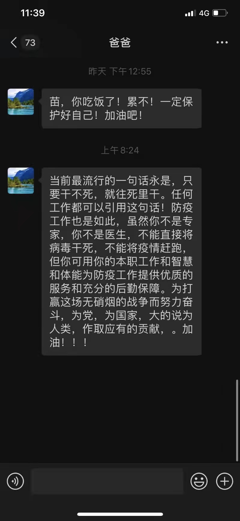 王茜的父親是一名退休老公安,典型的鋼鐵直男,給女兒發(fā)微信時說“當前最流行的一句話就是,只要干不死,就往死里干。任何工作都可以引用這句話,防疫工作也是如此,雖然你不是專家,你不是醫(yī)生,不能直接將病毒干死,不能將疫情趕跑,但你可以用你的本職工作、智慧和體能為防疫工作提供優(yōu)質的服務和充分的后勤保障。為打贏這場無硝煙的戰(zhàn)爭而努力奮斗,為黨、為國家,大的說為人類,作出應有的貢獻。加油?。?!”都說“虎父無犬女”,他們父女之間的微信聊天,就是這句話最好的驗證吧。