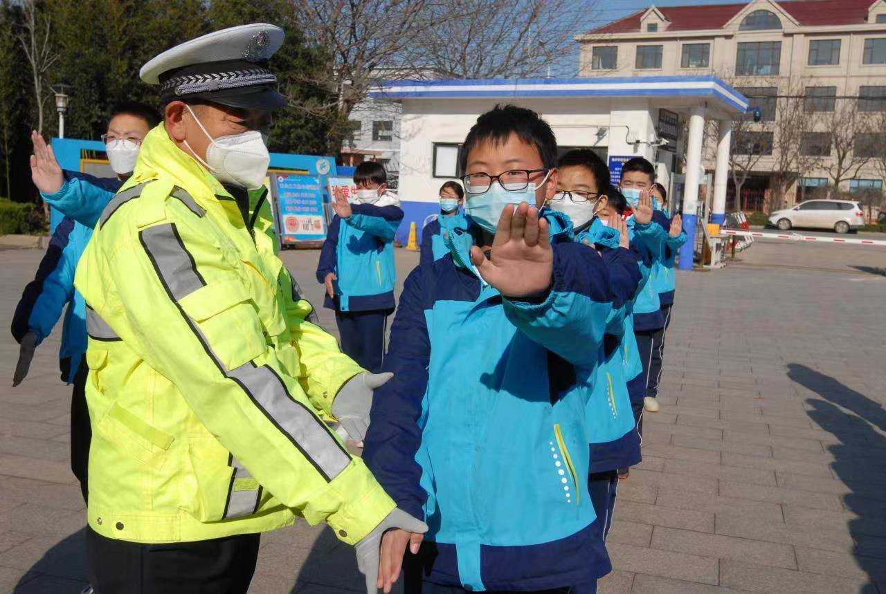 12月1日,山東省青島市即墨區(qū)藍(lán)村中學(xué)學(xué)生在民警的引導(dǎo)示范下,學(xué)習(xí)交通指揮手勢。