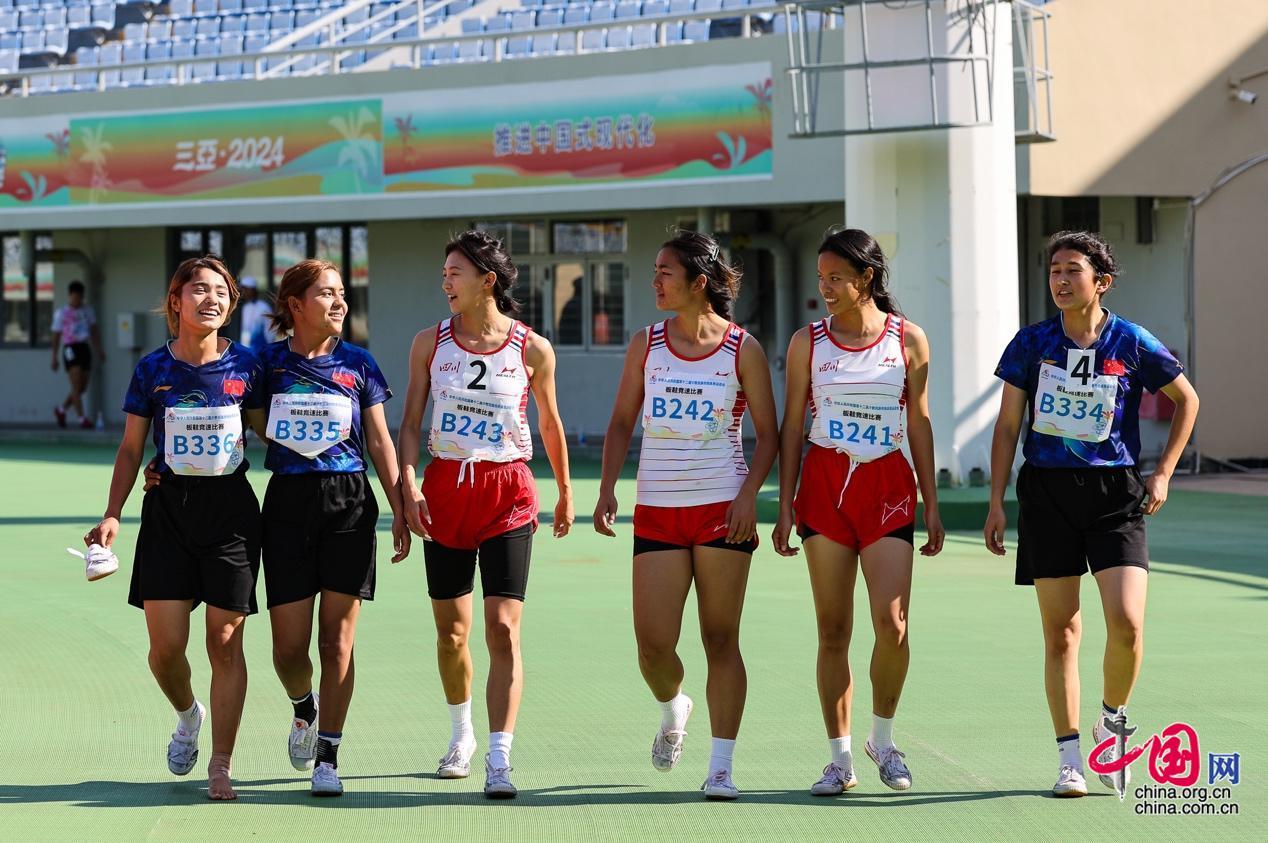 11月28日,第十二屆全國少數(shù)民族傳統(tǒng)體育運動會板鞋競速比賽女子三人板鞋項目在海南省三亞技師學(xué)院體育場舉行。圖為湖南代表團(tuán)選手和貴州代表團(tuán)選手賽后相互祝賀。中國網(wǎng)記者 董寧 攝影