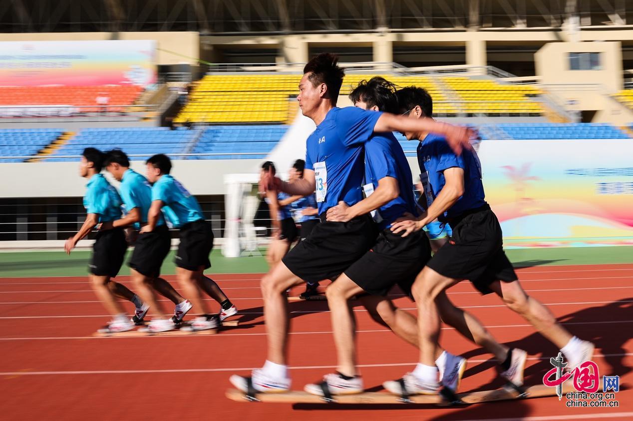 11月28日,第十二屆全國少數(shù)民族傳統(tǒng)體育運動會板鞋競速比賽男子三人板鞋項目在海南省三亞技師學(xué)院體育場舉行。中國網(wǎng)記者 董寧 攝影