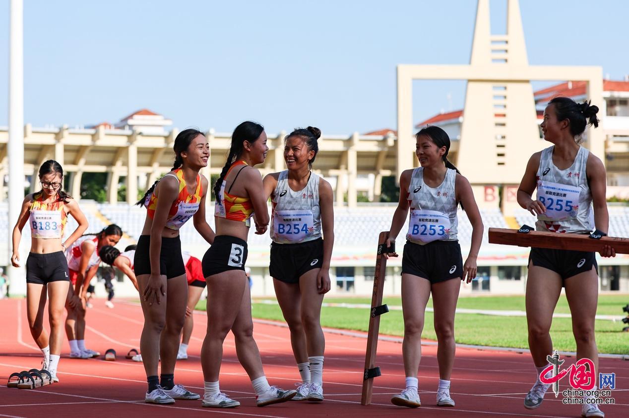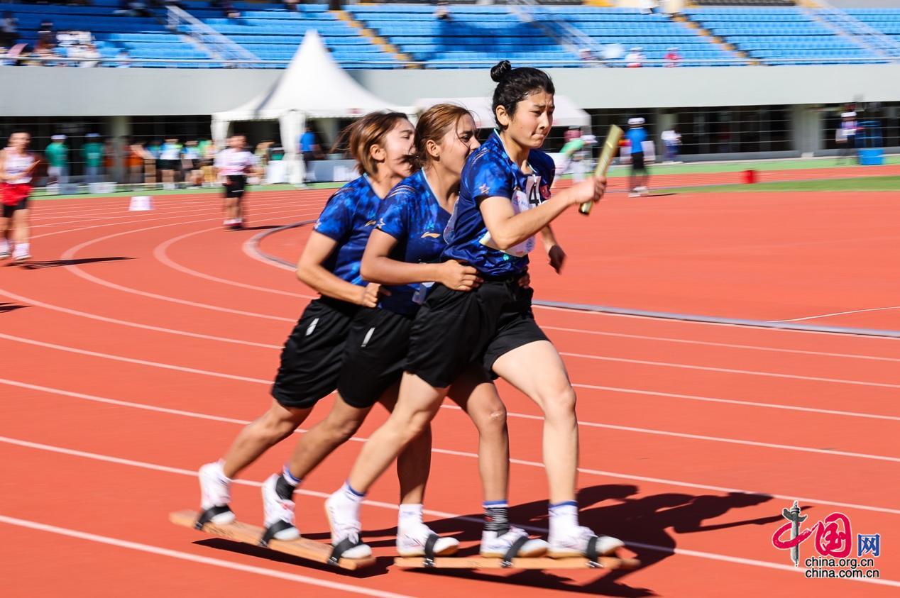 11月28日,第十二屆全國少數(shù)民族傳統(tǒng)體育運動會板鞋競速比賽女子三人板鞋項目在海南省三亞技師學(xué)院體育場舉行。中國網(wǎng)記者 董寧 攝影