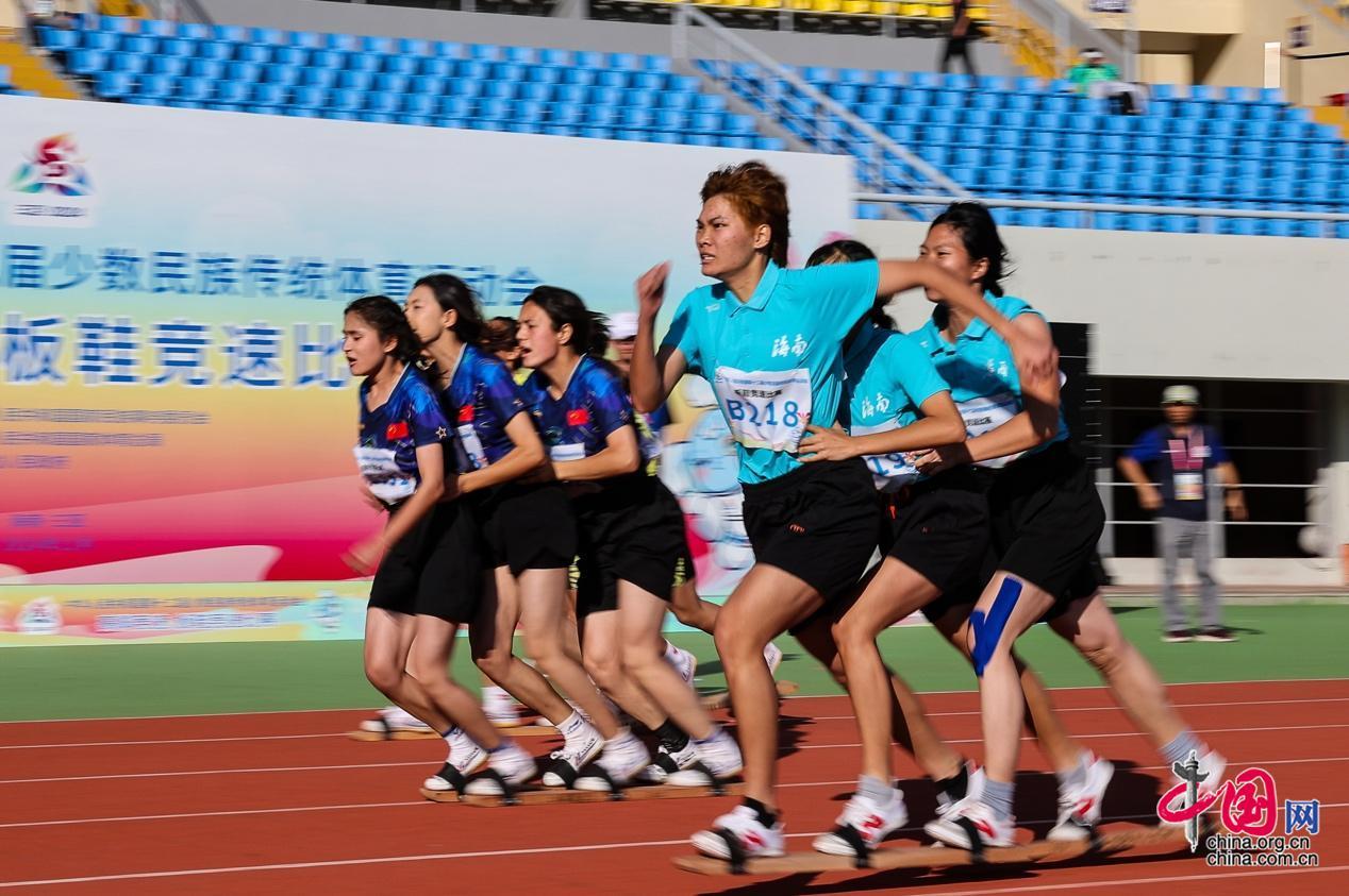 11月28日,第十二屆全國少數(shù)民族傳統(tǒng)體育運動會板鞋競速比賽三人板鞋混合接力板鞋項目在海南省三亞技師學(xué)院體育場舉行。中國網(wǎng)記者 董寧 攝影