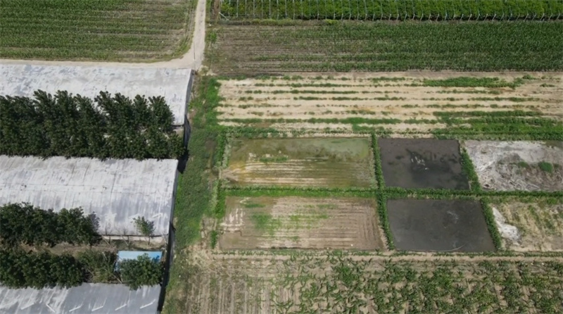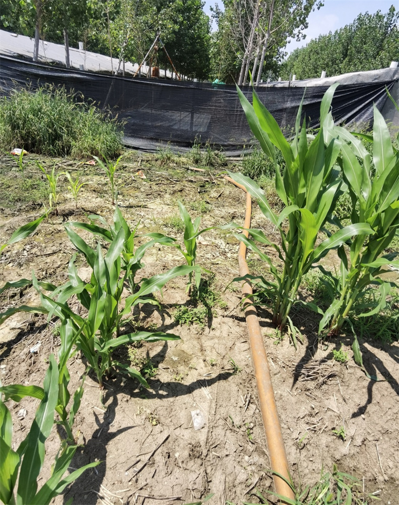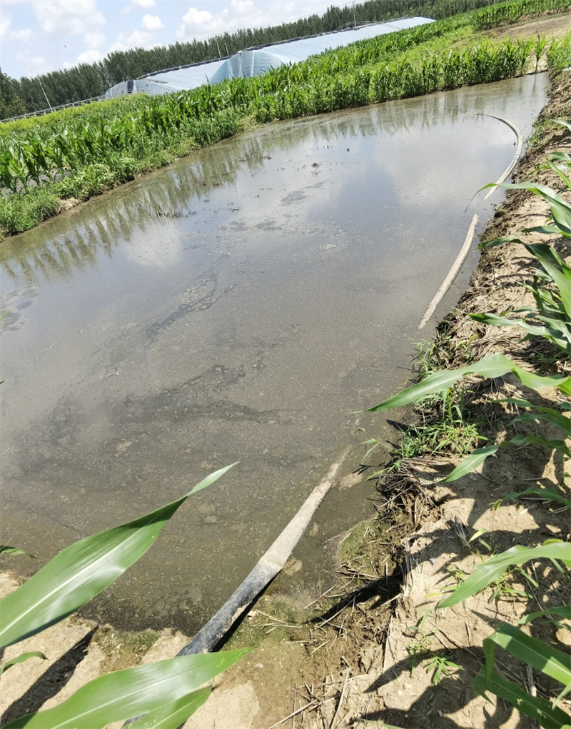 調(diào)查員7日到亓家莊村實地調(diào)查,在村民指引下來到養(yǎng)鴨場,這個養(yǎng)鴨場占地20多畝左右,有六個大型養(yǎng)殖棚。在養(yǎng)鴨場東側(cè)的農(nóng)田里,靠近就聞到陣陣臭味,地壟上長著雜草,地里黑臭寸草不生,沉積著鴨毛等垃圾,踩上去很軟,村民說這是糞水淹過后曬的。沿地壟向東走,看到還沒滲下去的黑臭糞水。再向南還有幾個大坑,滿滿的黑臭糞水,從養(yǎng)鴨場伸出的一根粗塑料管子通向大坑,坑邊種著部分玉米,從遠處看大坑被玉米擋得很嚴實,但陣陣臭味還是出賣了它們的存在。排放糞水的農(nóng)田大約在十幾畝地左右,村民說這地就白白浪費了,種上糧食多好。