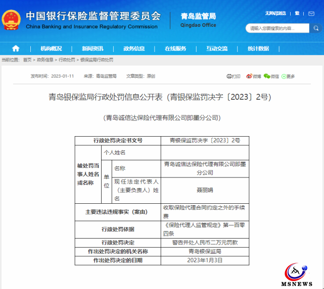 從違規(guī)違法事由來(lái)看,青島誠(chéng)信達(dá)保險(xiǎn)代理有限公司即墨分公司被指存在違規(guī)收取保險(xiǎn)代理合同約定之外的手續(xù)費(fèi)行為,對(duì)其給予警告并處以人民幣2萬(wàn)元的罰款。