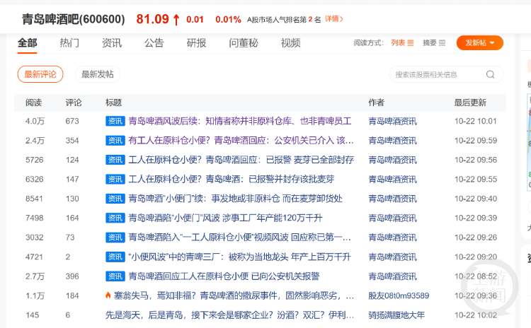 10月22日,“青島啤酒”在東財(cái)個(gè)股人氣榜中排名第二。網(wǎng)上搜索發(fā)現(xiàn),“史上最貴的一泡尿”“這一泡尿市值上億”等,成為網(wǎng)絡(luò)熱詞,有多篇文章分析“小便門”對企業(yè)可能造成的影響。