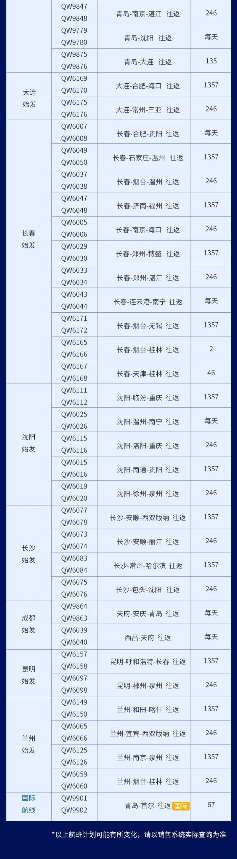 同時,為滿足東北地區(qū)旅客的商務(wù)、旅游需求,青島航空在繼續(xù)執(zhí)飛沈陽=溫州=南寧等航線的基礎(chǔ)上,新增長春=石家莊=溫州等十余條涉及東北地區(qū)的航線,通達(dá)天津、長沙、南寧、桂林、昆明、石家莊、溫州、石家莊等數(shù)十個城市,為廣大旅客出行提供便捷溫馨的服務(wù)。