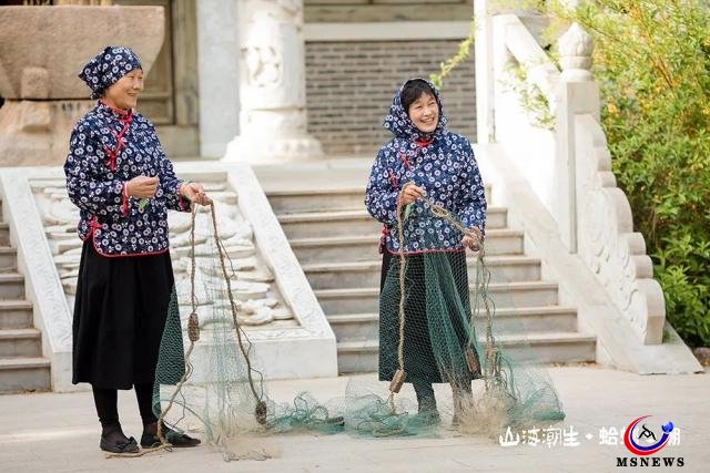韓家民俗村的兩位非遺傳承人為游客展示紅島非物質(zhì)文化遺產(chǎn)項(xiàng)目漁網(wǎng)編制技藝。